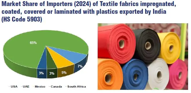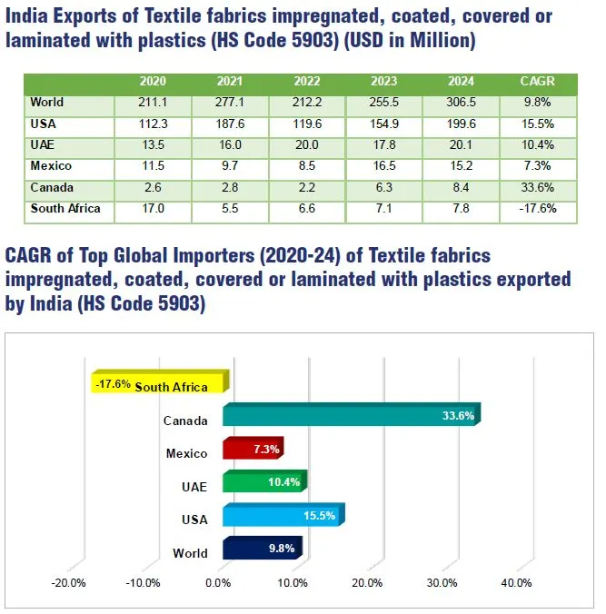Overview: A vast and intricate network of intermediaries plays acrucial role in the flow of PVC coated fabrics acrossIndia. This includes specialized dealers and wholesalersstrategically located in major urban centers such asDelhi, Mumbai, Ahmedabad, Bangalore, and Chennai,ensuring widespread availability.India’s total exports of HS Code 5903 fabrics haveshown a healthy increase, growing from $211.1 million in2020 to $306.5 million in 2024, achieving a CompoundAnnual Growth Rate (CAGR) of 9.8%. This signifiesIndia’s growing capability and presence in the globalmarket for these specialized textiles.There was a dip in exports in 2022 ($212.2 million)after a peak in 2021 ($277.1 million). However, exportsrecovered strongly in 2023 and 2024, demonstratingresilience and increasing demand for Indian products.This fluctuation could be attributed to global economicconditions, supply chain issues, or shifts in demandfrom key markets. India is demonstrating significantpotential in exporting these specialized textile fabrics,with a healthy overall growth rate.While the US dominates, the strong growth in Canadaand the impressive surge in Mexico opportunities fordiversification and expanding India’s export base inNorth America. The dips in 2022 for overall exports andspecifically to the US and Mexico underscore how globaleconomic conditions and supply chain dynamics caninfluence India’s export performance in this sector. Thegrowing exports of these coated fabrics reflect India’sincreasing focus and capabilities in the technical textilesector, a high-value segment of the textile industry.